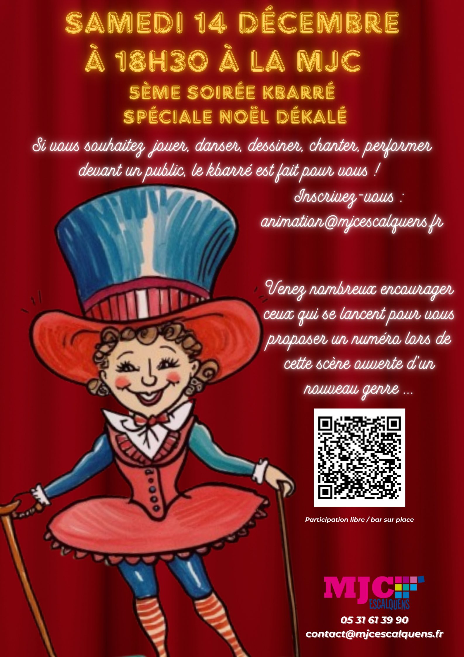 Vous l’attendiez tous, il revient, le fameux Kbarré scène ouverte de la MJC ! Vous avez envie de nous faire découvrir un numéro, un texte, une chanson, etc…? N’hésitez plus ! Inscrivez-vous vite à notre cinquième soirée K Barré spéciale Noël qui aura lieu samedi 14 décembre. Dans l’après-midi, vous serez pris en charge par notre intervenant théâtre Vincent qui vous préparera à votre passage sur scène et à 18h30 à vous de jouer, rien que pour le plaisir, tout délire est permis, la seule limite est votre imaginaire !